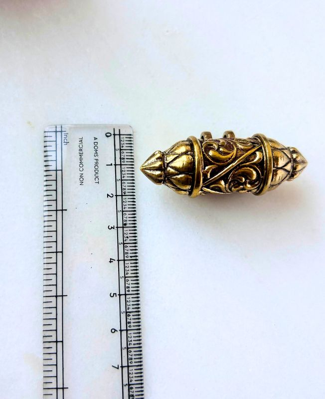Antique-style brass amulet pendant with intricate carved details, designed as a hollow tube for inserting small keepsakes, charms, or prayers. Perfect for bohemian or tribal jewelry creations.