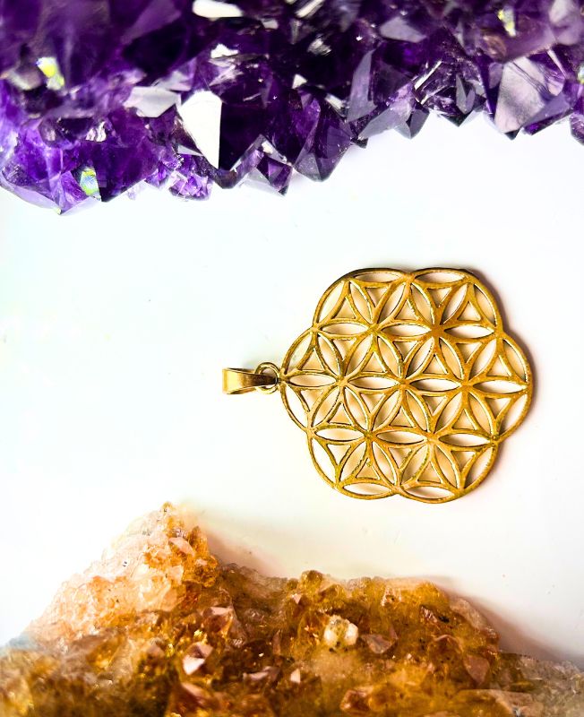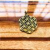 A bold brass pendant featuring the timeless Flower of Life pattern, known for its symbolic geometry and spiritual significance.