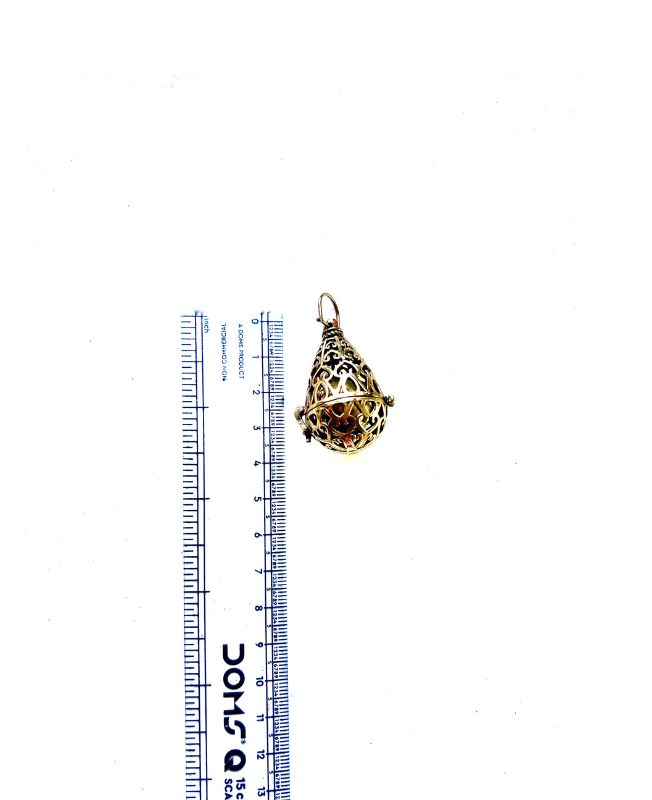 Intricate teardrop-shaped brass pendant featuring open filigree detailing and a hinged clasp. Ideal for use as an aroma diffuser, prayer box, or as a statement jewelry component.
