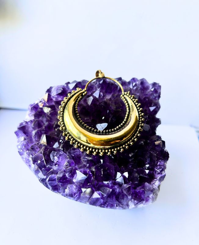 Bold crescent-shaped brass pendant featuring a traditional granulated bead border. This handcrafted piece blends vintage charm with tribal elegance, ideal for statement jewelry creations.