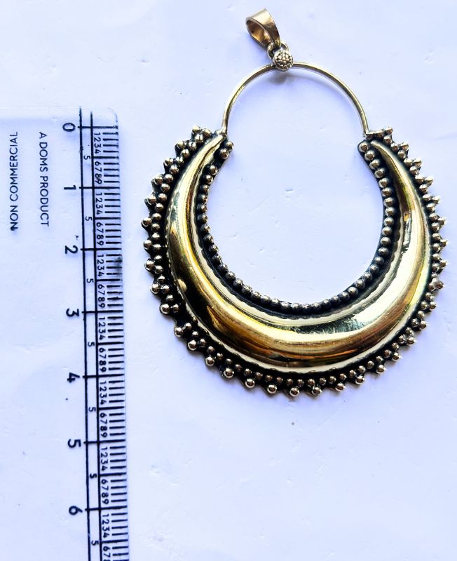 Make a bold statement with this handcrafted crescent brass pendant, designed with intricate bead-style edging for a distinct antique appeal. Its generously curved shape exudes traditional charm, while the polished finish enhances the vintage golden hue of the brass. The pendant includes a sturdy loop bail for easy integration with chains or cords, perfect for necklaces, chokers, or fusion jewelry.