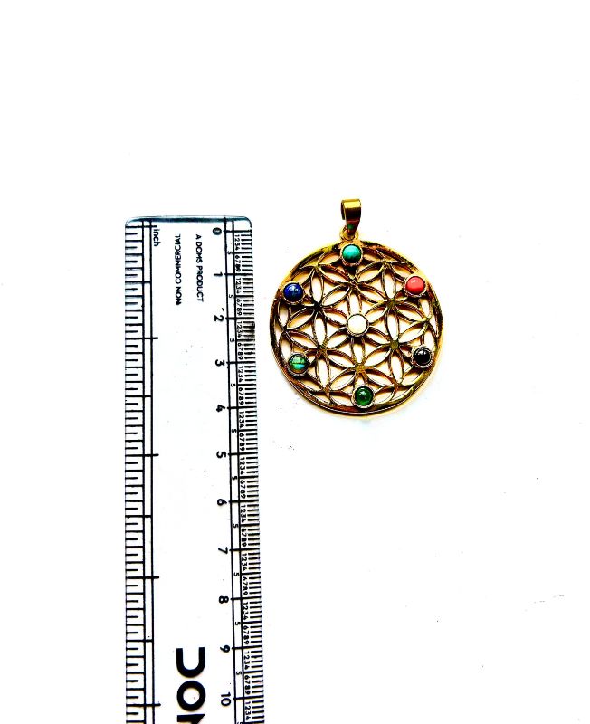 This stunning brass pendant is designed around the ancient and powerful Flower of Life motif, a sacred geometric symbol believed to represent the blueprint of the universe. Seven vibrant gemstone cabochons are set around the design, each symbolizing one of the body’s chakras: Root (red), Sacral (orange), Solar Plexus (yellow), Heart (green), Throat (blue), Third Eye (indigo), and Crown (violet/white).