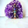 Celebrate divine feminine energy and holistic healing with this beautifully crafted lady chakra pendant. Made of raw brass, the open-form silhouette depicts a graceful feminine figure, symbolizing strength and serenity. The center is adorned with a vertical row of seven colorful stones, each representing one of the body’s chakras: root, sacral, solar plexus, heart, throat, third eye, and crown.