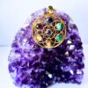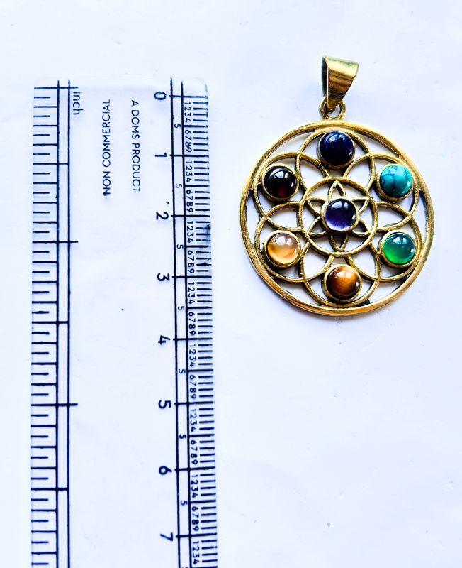 A round brass pendant adorned with seven chakra stones, arranged in a sacred geometric flower pattern. Symbolizes energy balance and spiritual harmony.