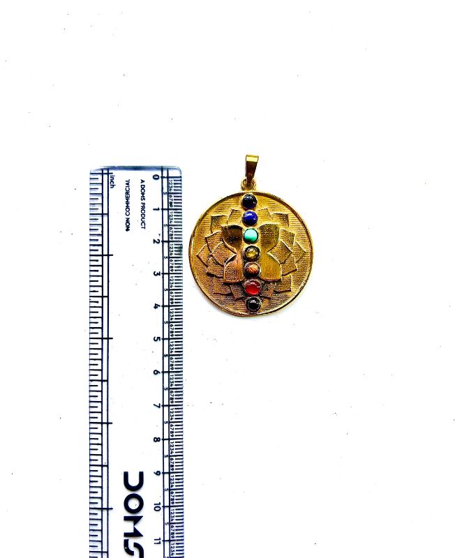 This round brass pendant features a beautifully embossed lotus flower design centered with seven colored gemstone beads, each symbolizing one of the body’s chakras. The vibrant stones include deep red, orange, yellow, green, turquoise, indigo, and violet tones, each placed vertically along the center of the pendant to encourage alignment and balance.