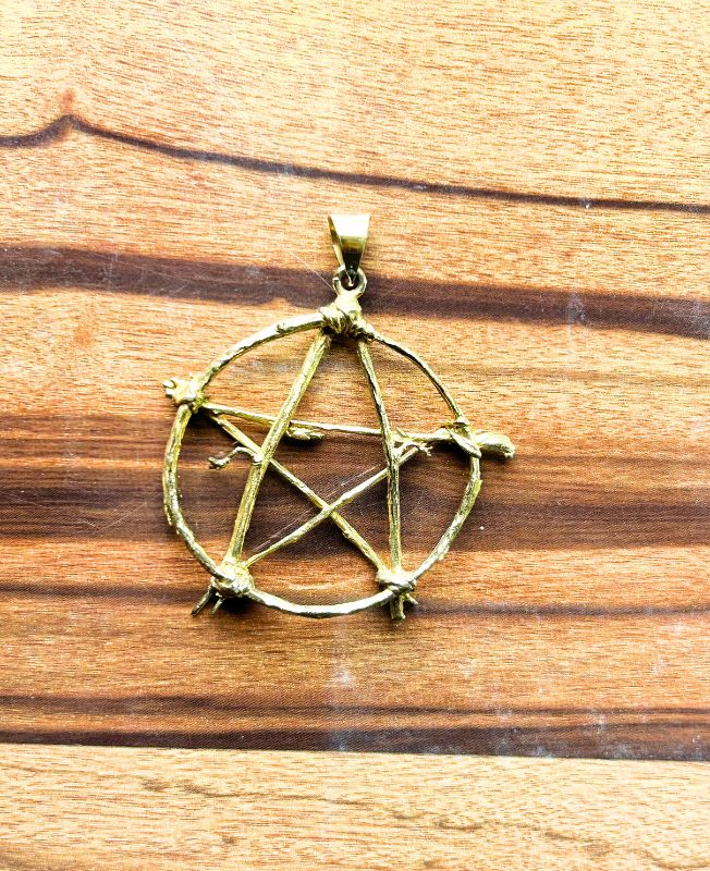 This handcrafted brass pendant showcases a powerful five-point star enclosed in a circular frame, representing harmony between spirit and elements. The star design has a rugged, organic structure resembling interwoven branches, giving it a natural, earthy look. Each angle is carefully detailed to evoke ancient symbolism and strength.