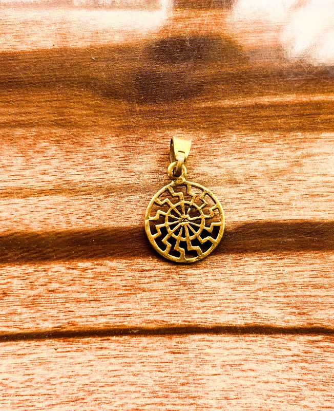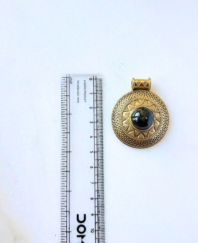 Intricately crafted round brass mandala pendant featuring a dark center stone, symbolizing balance and protection. Perfect for boho, spiritual, or artisan jewelry collections.
