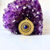 A radiant round brass pendant featuring intricate sunburst granulation and a central deep blue cabochon, perfect for statement necklaces and macrame designs.