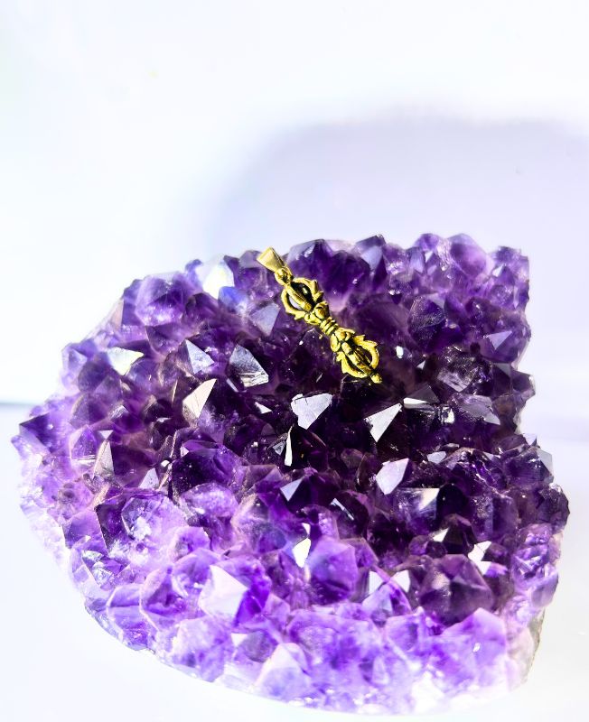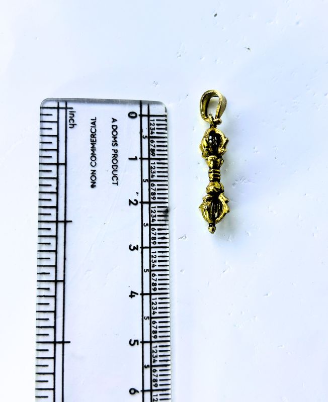 This intricately crafted small Vajra pendant is made from polished brass, representing the symbolic thunderbolt of Tibetan Buddhism. The Vajra is known for signifying strength, protection, and the indestructible nature of truth. This piece features fine detailing on both ends and a solid central core, reflecting the dual energy of compassion and wisdom.
