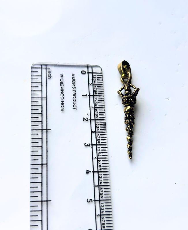 This intricately crafted brass pendant is inspired by the traditional Tibetan Phurba dagger, a ceremonial tool known for its symbolic power to banish evil spirits and purify energies. Measuring approximately 4.5 cm in length, the pendant displays detailed craftsmanship in its miniature form. The spiral blade and triple-face handle are distinct elements that add spiritual depth and ethnic charm.