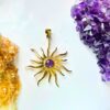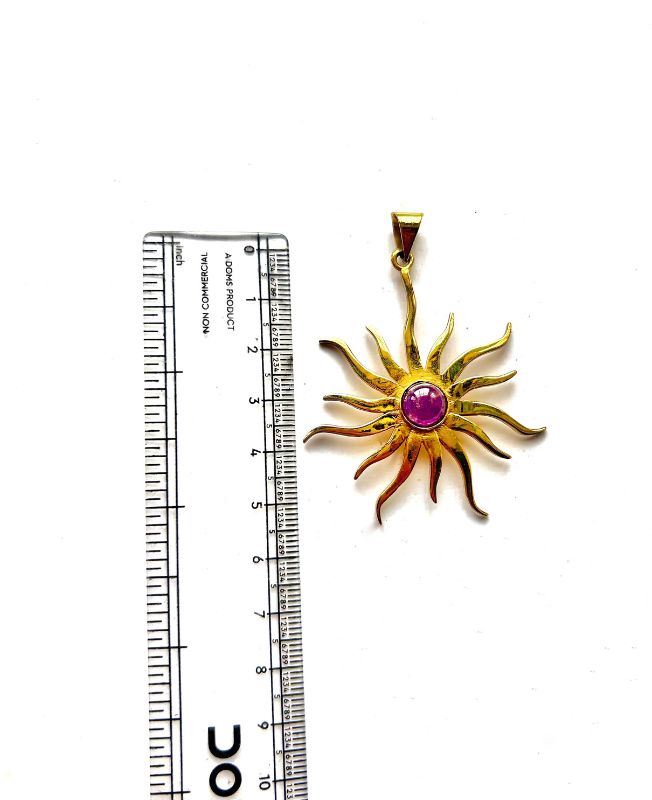 Shining brass sunburst pendant featuring a vibrant magenta center stone, symbolizing life, energy, and divine radiance.