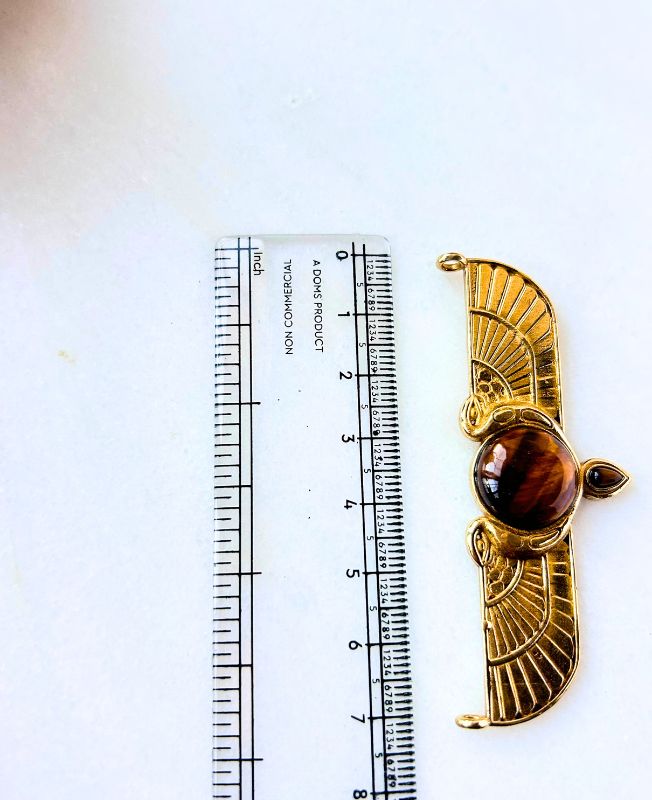 A stunning brass pendant featuring the ancient Egyptian winged scarab design with a central Tiger Eye gemstone that radiates grounding energy and protection.