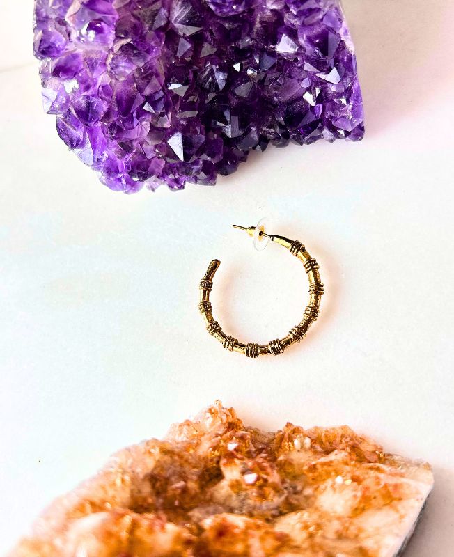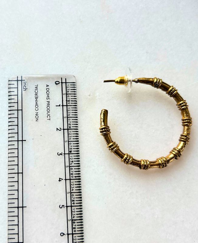 Elegant brass hoop earrings inspired by natural bamboo texture, handcrafted with detailed ridges and antique gold finish for a bold yet earthy style.