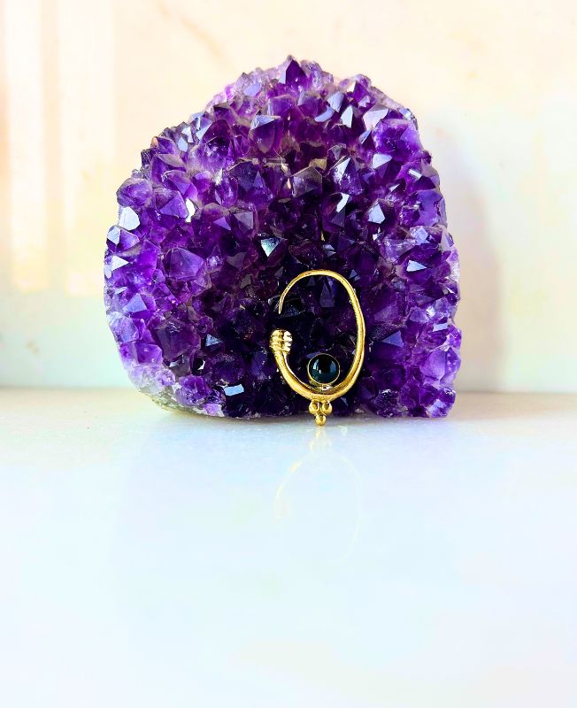 These beautiful brass earrings are designed in a tribal spiral form with a captivating black gemstone accent at the center. Each piece is handcrafted with precision to highlight the organic curves of the metal and the deep luster of the stone. Their hook-style open form makes them easy to wear while offering a bold, statement look.