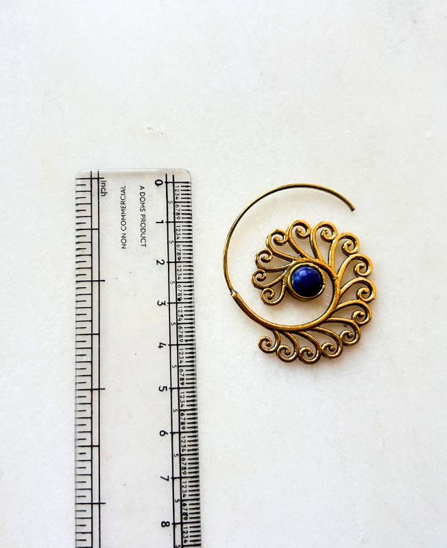 These handcrafted brass spiral earrings combine artistry and symbolism in one stunning piece. The design features an intricate filigree pattern swirling gracefully around a vibrant blue stone, reminiscent of celestial and spiritual motifs.