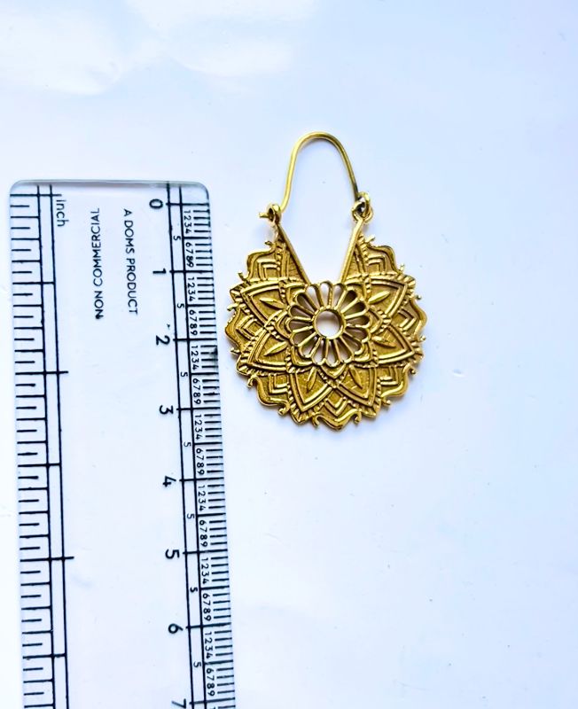 These bold brass earrings are a celebration of balance and beauty, inspired by traditional mandala motifs. The intricate layers of floral and geometric designs offer both depth and symmetry, making them a unique choice for statement jewelry. Crafted in an antique gold finish, they bring warmth and richness to any look.