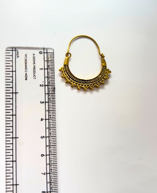 Add a bold tribal flair to your jewelry line with these beautifully handcrafted brass earrings. Designed in a classic drop shape with a fixed closure, they feature a curved structure with ornate dotted detailing across the rim, finished in an antique gold tone for a rich, earthy appeal