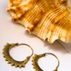 Handcrafted tribal earrings in antique brass tone featuring intricate beaded edge accents and a curved drop silhouette.
