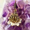 This beautiful brass jhumka earring combines traditional charm with intricate detailing. The dome-shaped filigree base features a vintage golden finish, while small pearl beads dangle gracefully around the edge, adding a touch of sophistication.