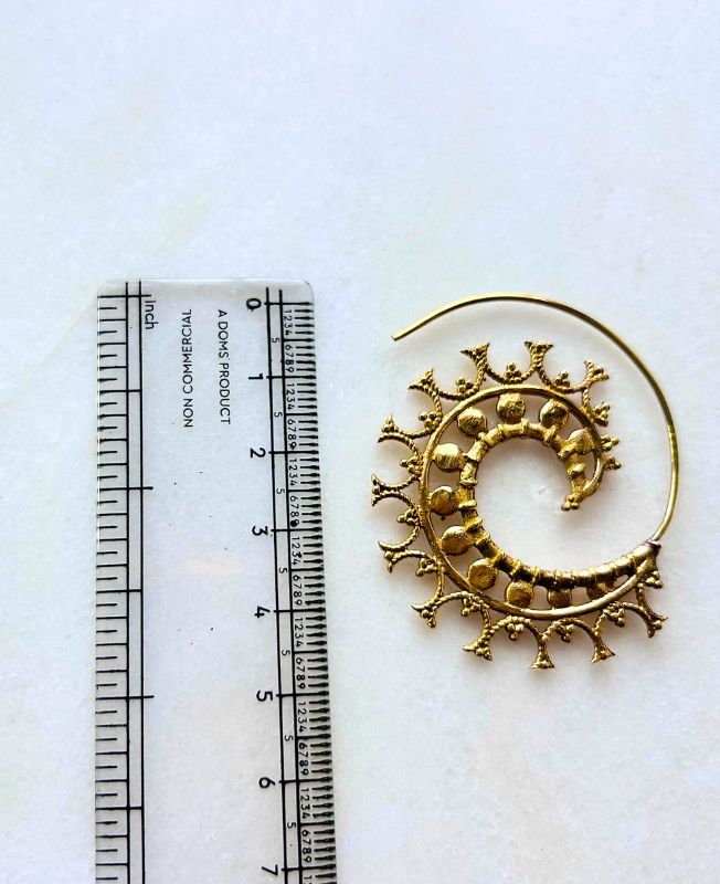 This handcrafted brass spiral earring showcases detailed filigree artistry with a unique sunburst pattern that spirals gracefully outward. Designed to reflect a blend of tribal charm and contemporary elegance, this piece adds a touch of sophistication and authenticity to any outfit.