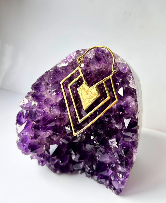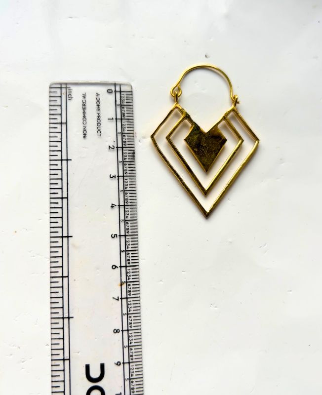 Add a touch of bohemian charm to your jewelry collection with these handcrafted tribal earrings made from solid brass. Featuring a striking triple-chevron frame with a bold geometric centerpiece, these earrings are perfect for statement wearers.