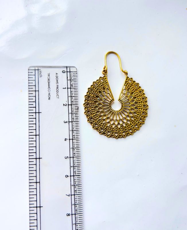Stylish handcrafted brass earrings featuring a delicate filigree design with a timeless circular pattern. Perfect for adding a touch of elegance to casual or festive looks.
