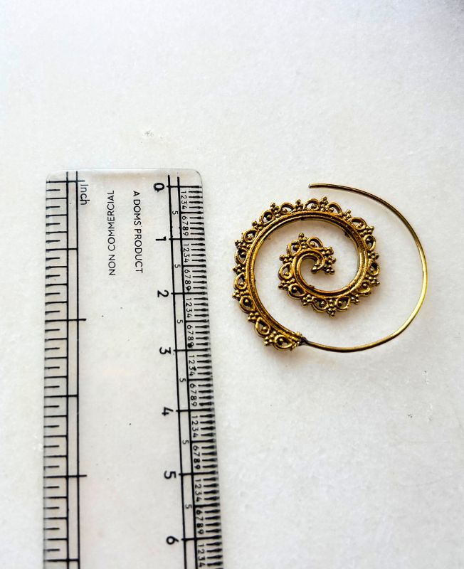 Elegant spiral-shaped brass hoop earrings with intricate filigree detailing. Perfect for a bohemian or tribal-inspired look. Lightweight and artistic, these earrings bring an ethnic charm to any outfit.