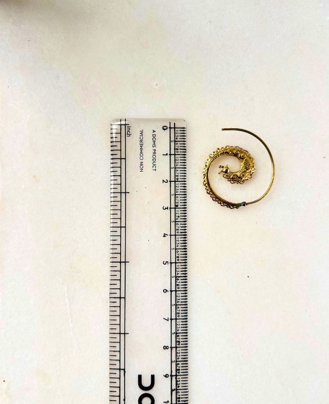 Elegant handcrafted brass spiral hoop earring with intricate filigree detailing, designed in a graceful circular swirl pattern for a boho-chic statement look.