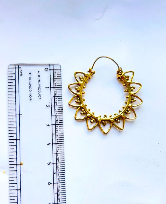 These striking hoop earrings feature an intricate floral-like pattern of open petal loops radiating around the circular base. Each loop is adorned with dotted beadwork that adds beautiful depth and texture. Made from durable brass in an antique gold finish, these earrings are ideal for statement jewelry or ethnic-inspired looks.