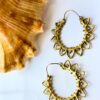 These striking hoop earrings feature an intricate floral-like pattern of open petal loops radiating around the circular base. Each loop is adorned with dotted beadwork that adds beautiful depth and texture. Made from durable brass in an antique gold finish, these earrings are ideal for statement jewelry or ethnic-inspired looks.