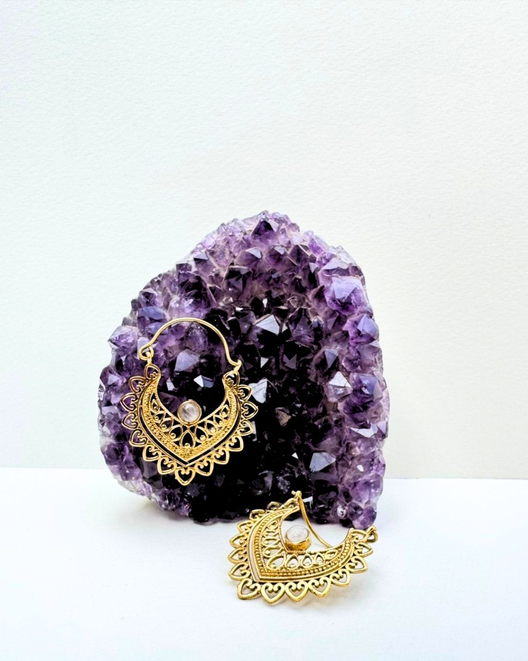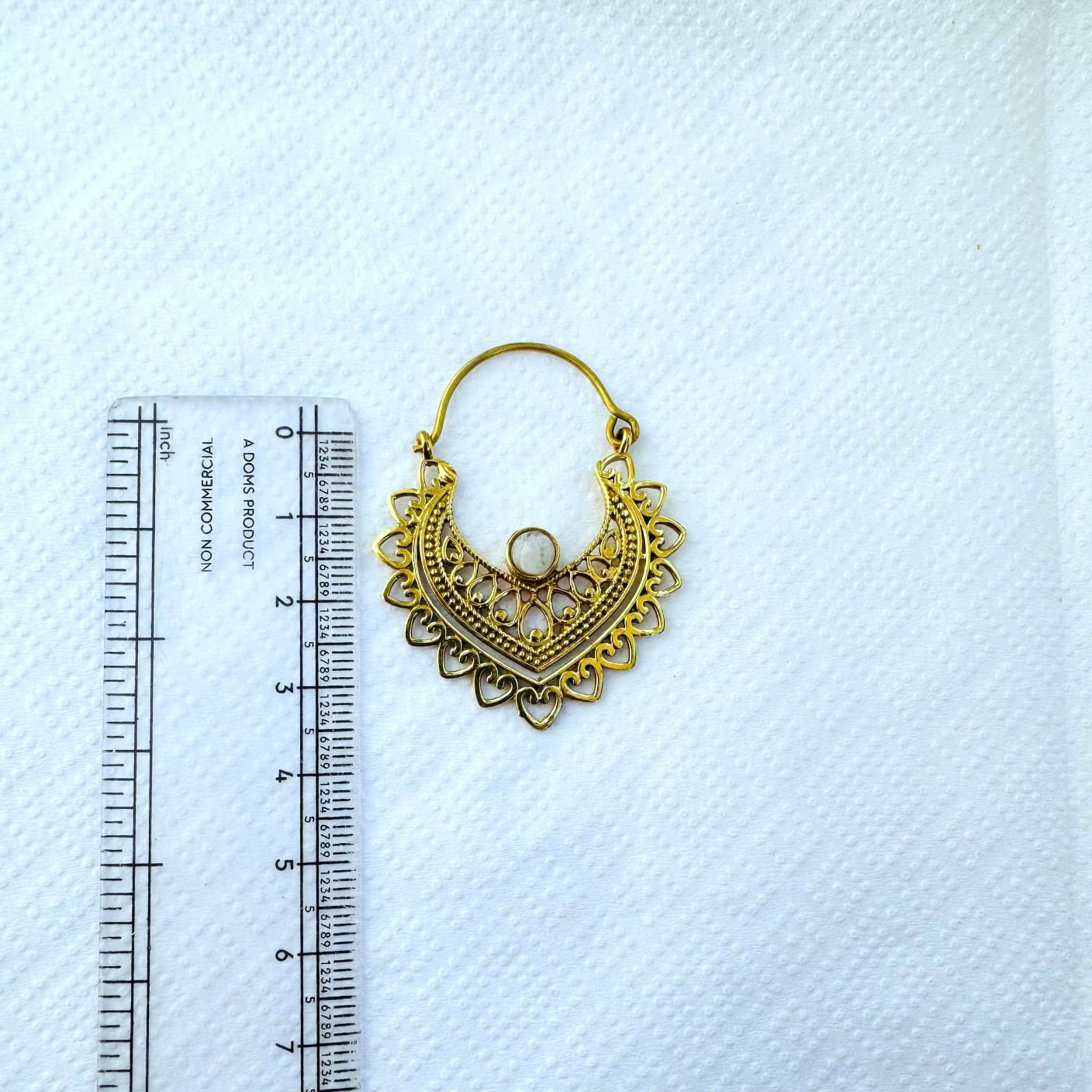 These beautifully crafted brass earrings feature an intricate crescent-inspired design enriched with fine filigree details and a small round stone accent at the center. The layered openwork pattern gives the earrings depth and texture while keeping them light and comfortable to wear.