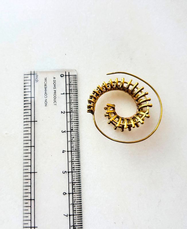 Elegant handcrafted brass spiral earrings featuring intricate filigree work, designed to add a bold yet refined accent to your look.