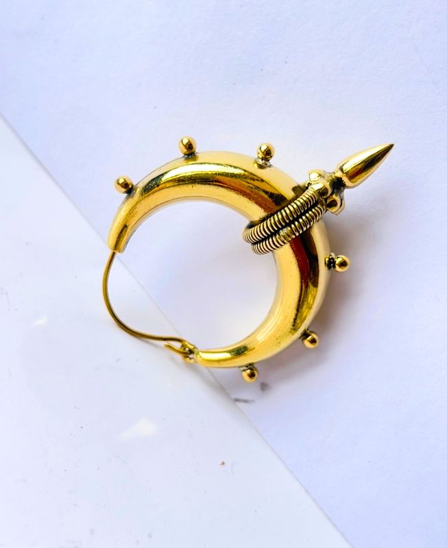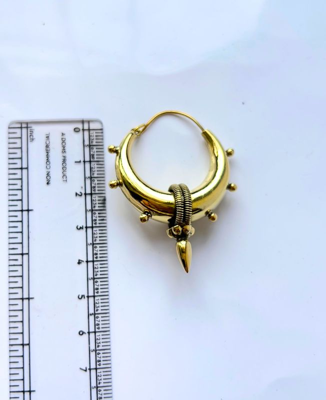 This brass earring features a crescent-shaped hoop adorned with symmetrical rounded studs and a central wrapped coil. The focal point is a dangling spike charm that enhances its dramatic silhouette.