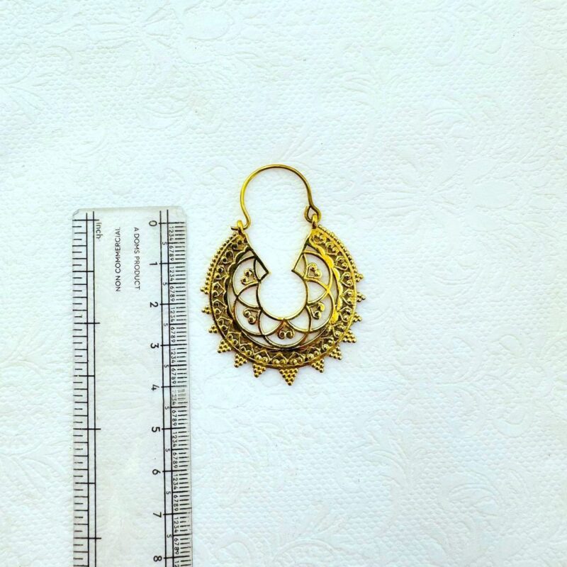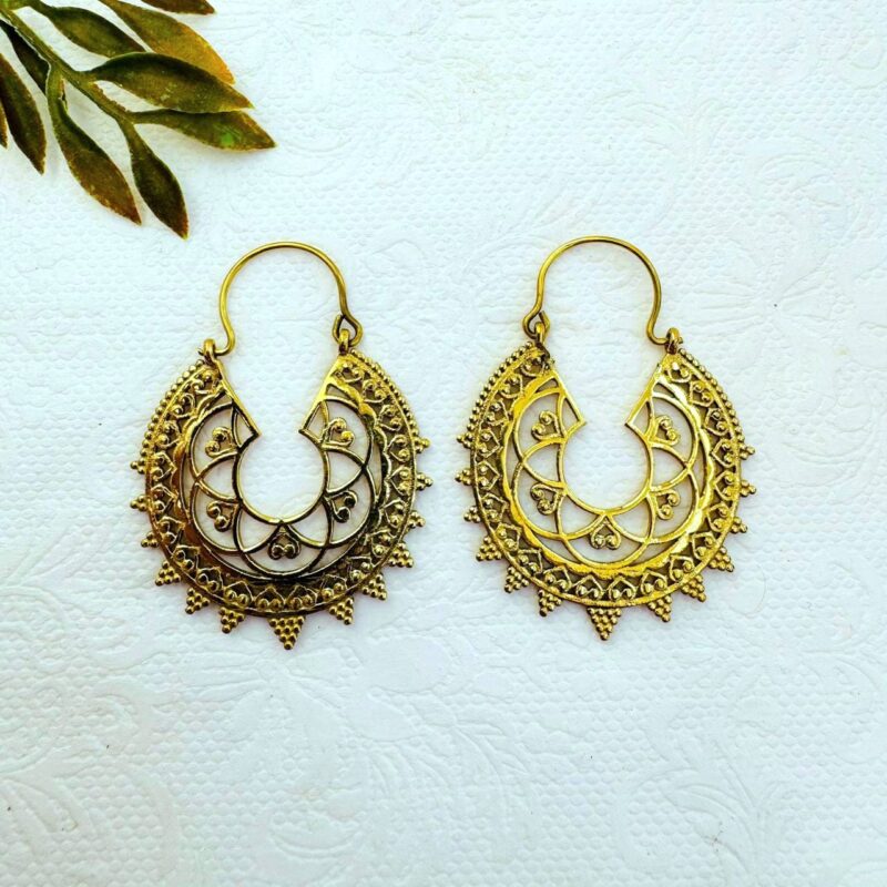 These handcrafted brass earrings feature an elegant crescent silhouette enriched with intricate filigree detailing and fine beaded accents along the outer edge. The layered openwork design creates depth and movement while maintaining a balanced, harmonious shape.