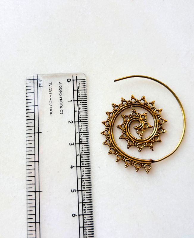 Elegant handcrafted spiral earrings in raw brass featuring ornate tribal filigree details. These earrings combine a bold bohemian statement with timeless brass craftsmanship perfect for free spirits and artisan jewelry lovers.