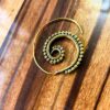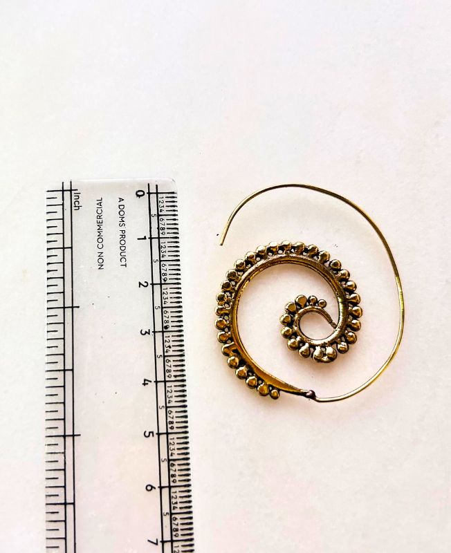 Elegant handcrafted brass spiral earring featuring intricate beaded detailing in a flowing spiral shape, blending bohemian artistry with traditional craftsmanship.
