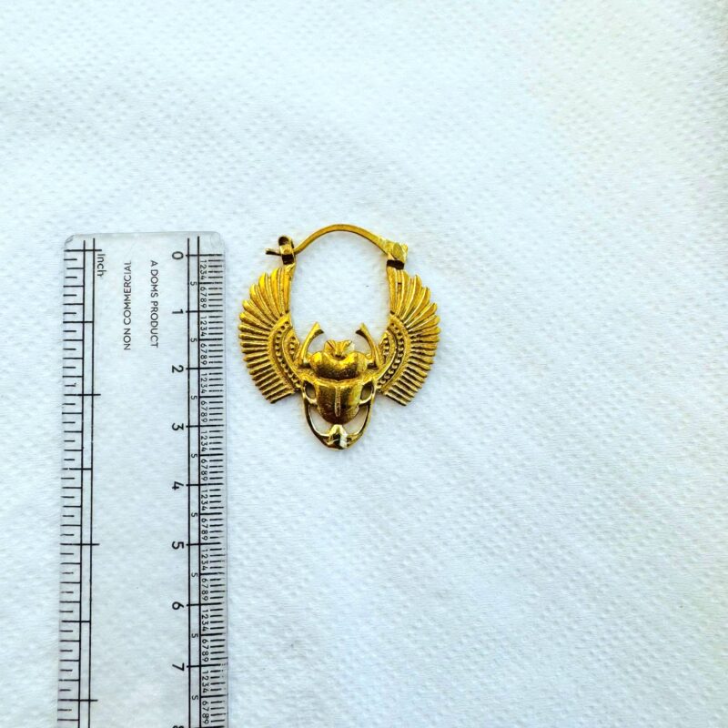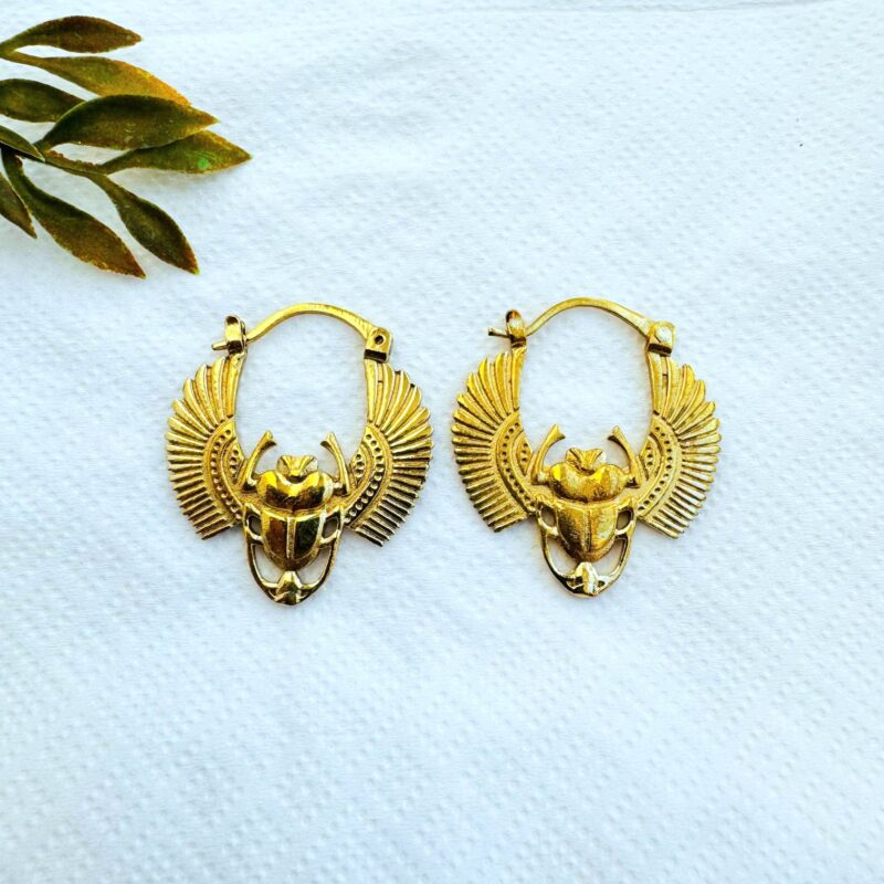 These striking winged scarab earrings are crafted in polished brass and inspired by ancient Egyptian iconography. The scarab beetle, a sacred symbol of rebirth, protection, and transformation, is depicted with fully spread, finely detailed wings that create a strong yet elegant silhouette.