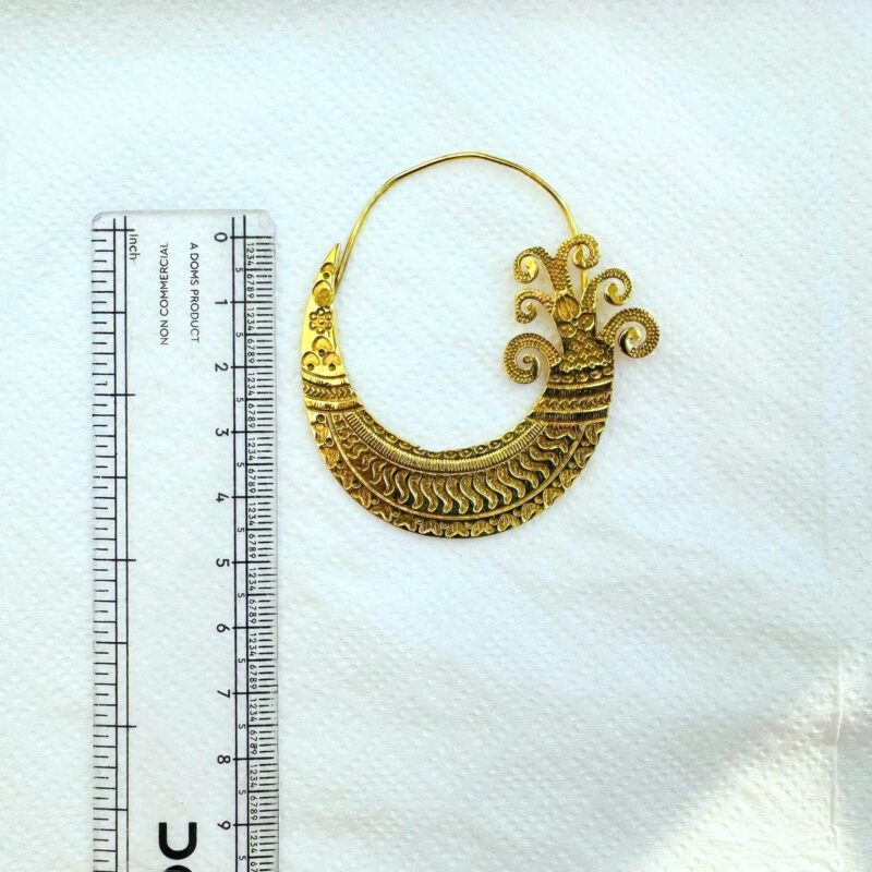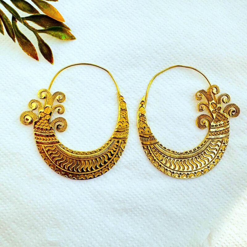 These ornate brass crescent hoop earrings feature a striking ethnic-inspired design with deeply engraved patterns and elegant scroll details at the top. The crescent shape is beautifully balanced by the fine textures and rhythmic motifs, giving the earrings a powerful yet refined presence.