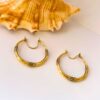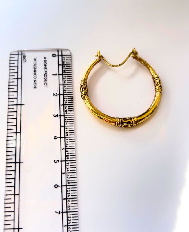 Statement gold-tone brass hoop earrings with engraved tribal-style accents. A bold and elegant addition to any look.