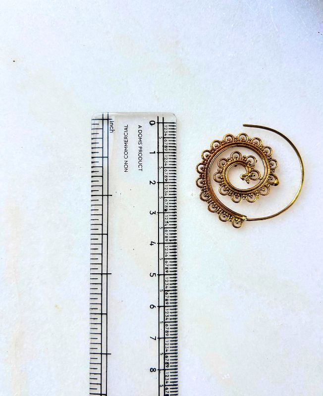 This exquisite brass spiral filigree hoop earring showcases detailed craftsmanship and timeless elegance. Designed in a circular spiral shape with ornamental filigree edges, it reflects a perfect balance of ethnic and contemporary aesthetics. Each piece is hand-polished for a warm golden finish that enhances its intricate texture.