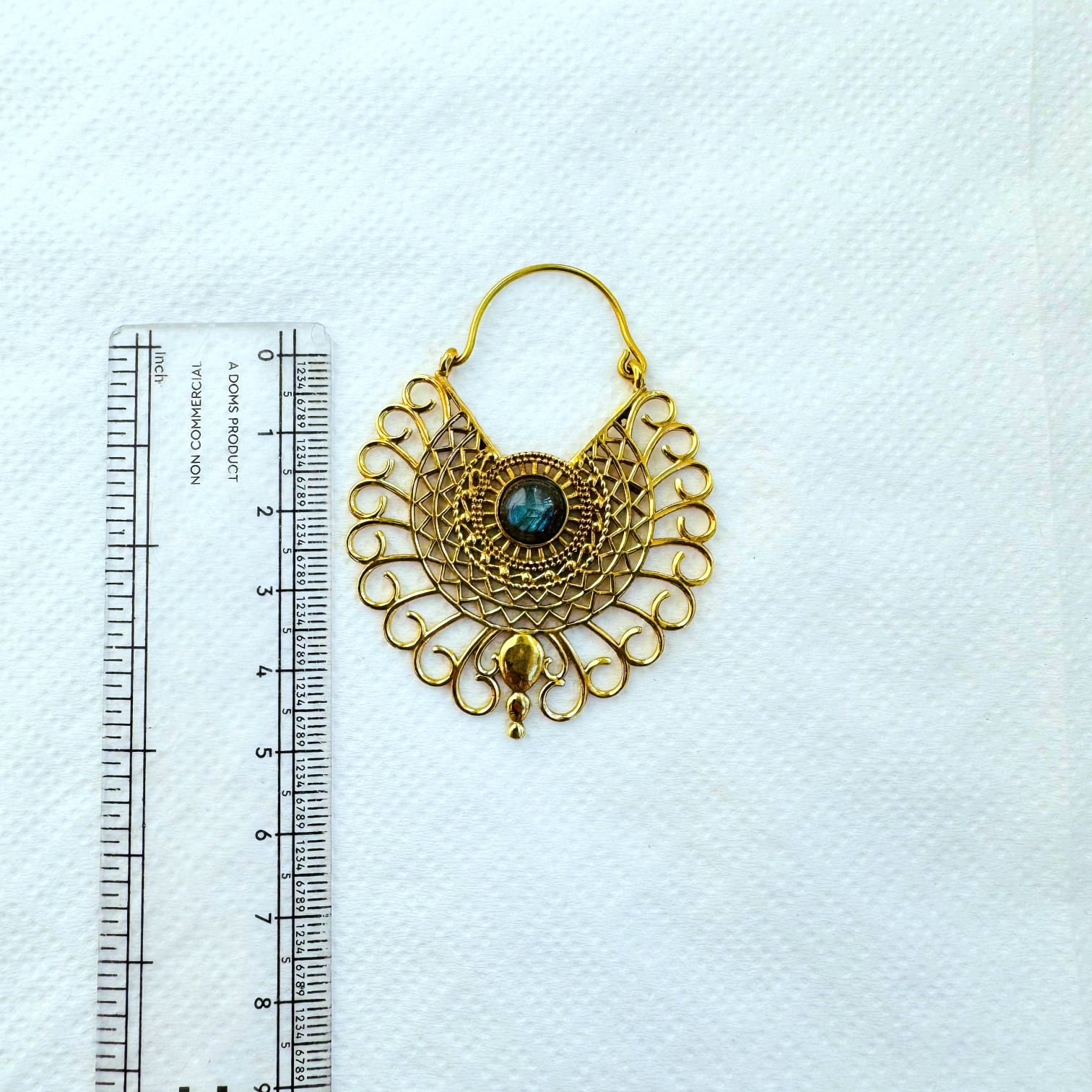 Handcrafted gold plated brass earring featuring a intricate filigree work and a luminous labradorite stone centerpiece. Lightweight and perfect for a bold yet elegant look.
