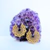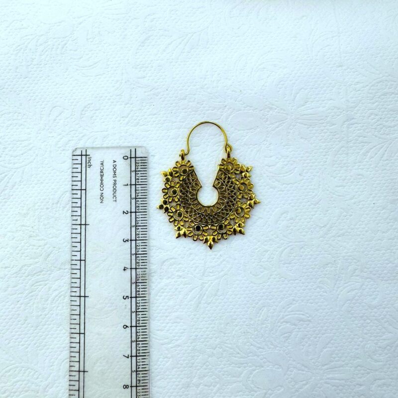 These brass earrings feature a rich, symmetrical mandala pattern inspired by traditional floral motifs. The layered design combines engraved textures with small flower like elements arranged along the outer edge, creating depth and visual movement while maintaining a balanced, harmonious shape.