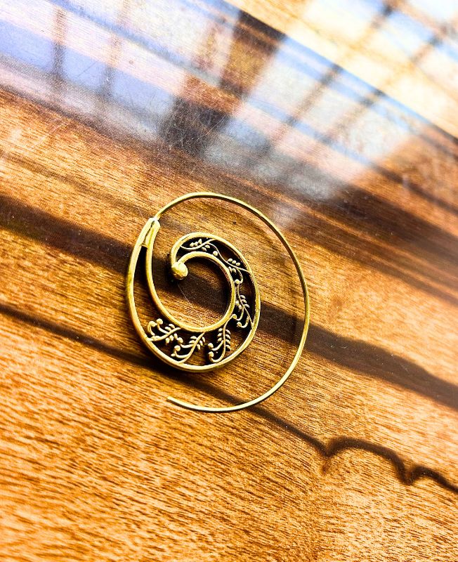 Elegant spiral earrings handcrafted from solid brass, featuring intricate floral filigree detailing. Lightweight and artistic, they are perfect for bohemian and ethnic inspired styles.