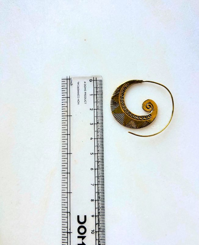 This handmade brass spiral filigree hoop earring showcases a detailed spiral design with engraved geometric accents that highlight the traditional beauty of brass jewelry. The piece reflects both artistry and craftsmanship, combining vintage charm with modern versatility.