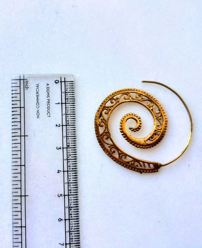Elegant spiral brass earrings featuring intricate filigree work and a graceful swirling design, lightweight, artistic, and perfect for bohemian or tribal-inspired looks.