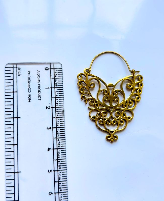 These ornate earrings feature a detailed filigree design in a heart-like shape, crafted from brass with an antique gold finish. Their rich and intricate swirls evoke a sense of vintage charm and cultural elegance, making them perfect for bold fashion statements, tribal styles, or bohemian accessorizing.