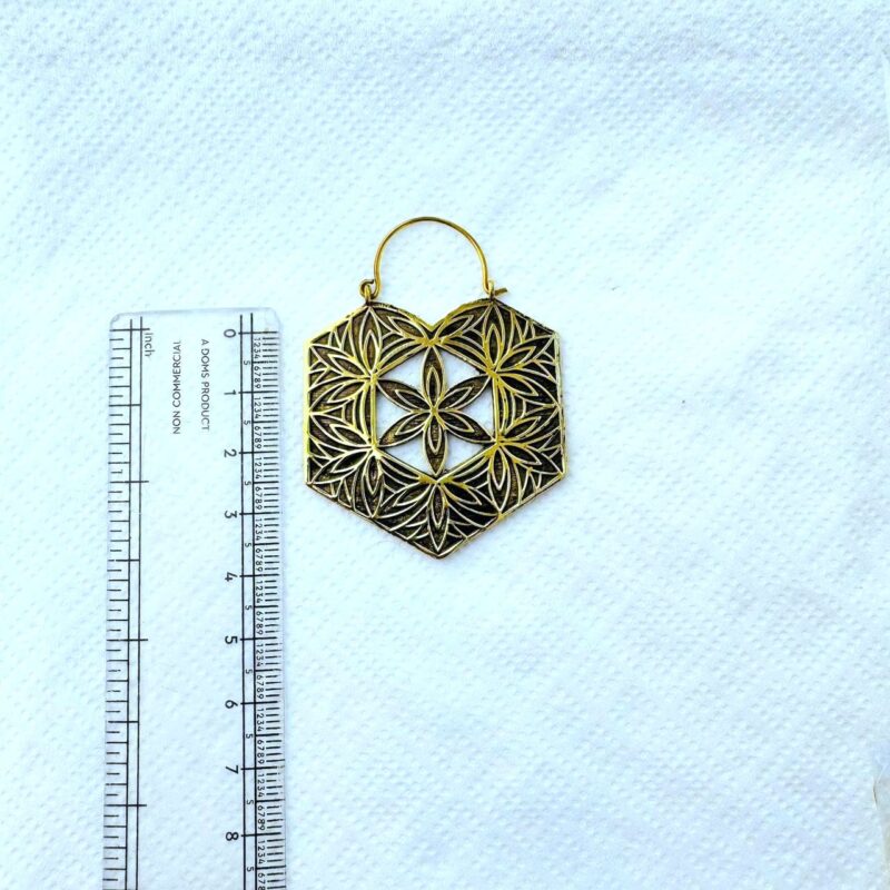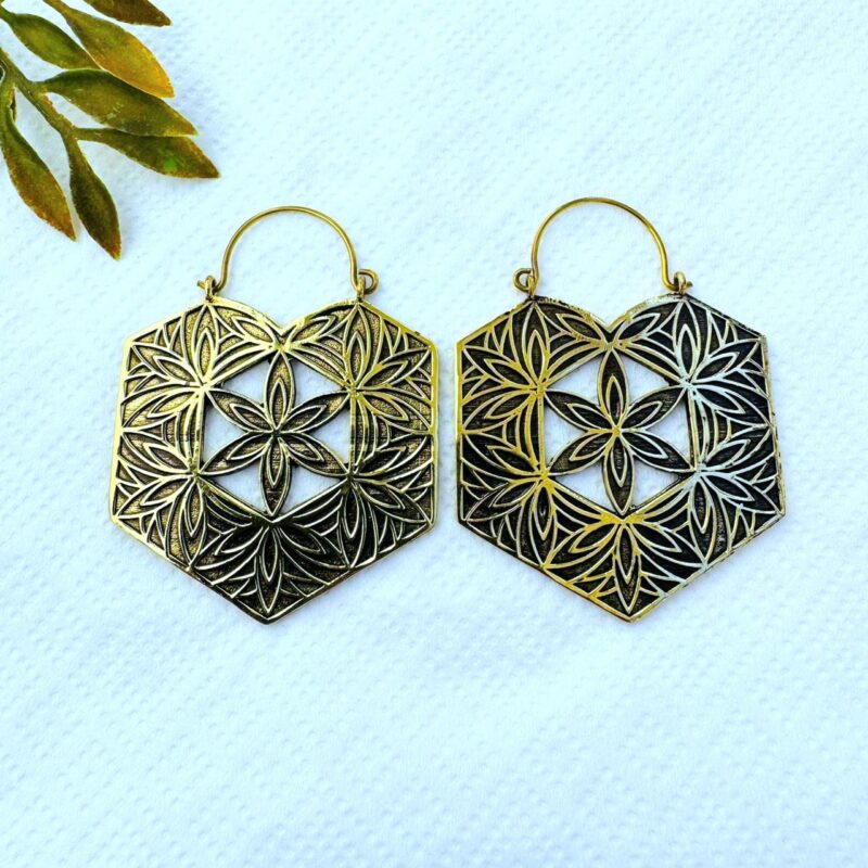 These Flower of Life brass hoop earrings showcase a powerful sacred geometry design framed in a bold hexagonal shape. The openwork pattern creates depth and lightness while keeping a strong, architectural presence.