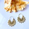 This golden brass charm features a stunning mandala-inspired design with intricate openwork details and petal-like edges. Perfect for statement earrings or as a central decorative piece in bohemian jewelry collections.