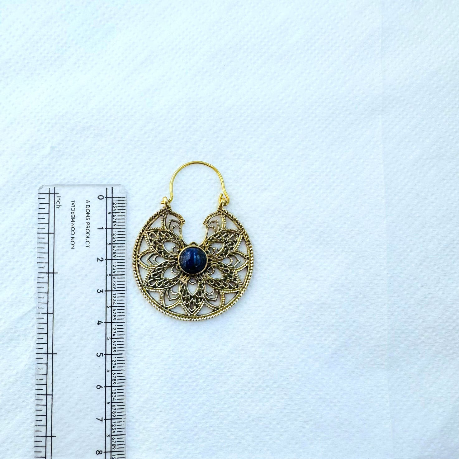 These beautiful round brass mandala earrings showcase an ornate flower-inspired filigree design, centered with a striking blue stone cabochon. The openwork petals radiate outward in a balanced, symmetrical pattern, creating depth and visual harmony.