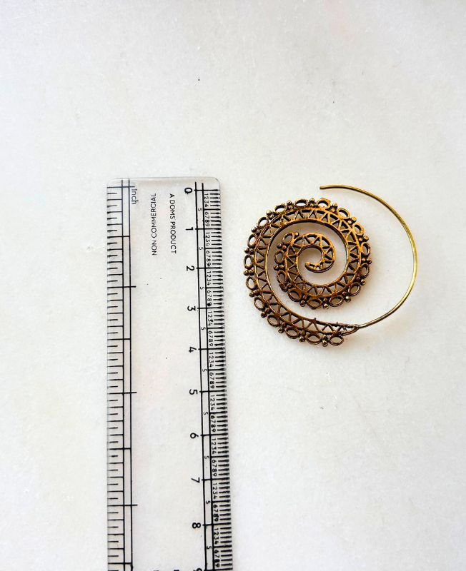 Elegant handcrafted brass spiral earrings featuring intricate filigree detailing in a swirling pattern. Lightweight and artistic, these earrings beautifully combine traditional metalwork with a contemporary bohemian feel.